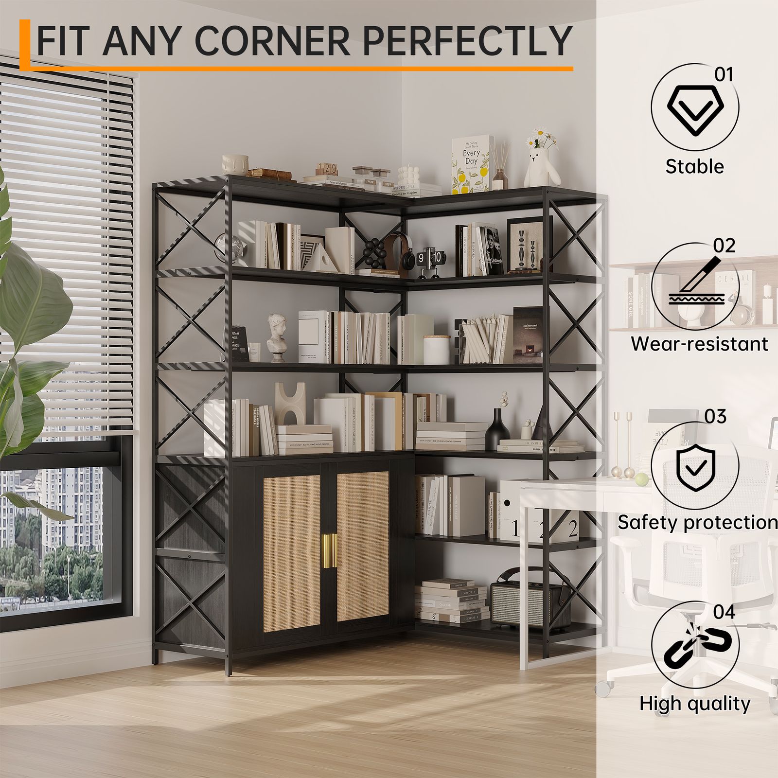 6-Shelf Corner Bookshelf, L-Shaped Space-Saving Bookcase with 2 Rattan Doors & Adjustable Shelves - Solid, Freestanding Corner Cabinet for Living Room, Bedroom, Home Office - Easy Assembly ( Wood Tone)