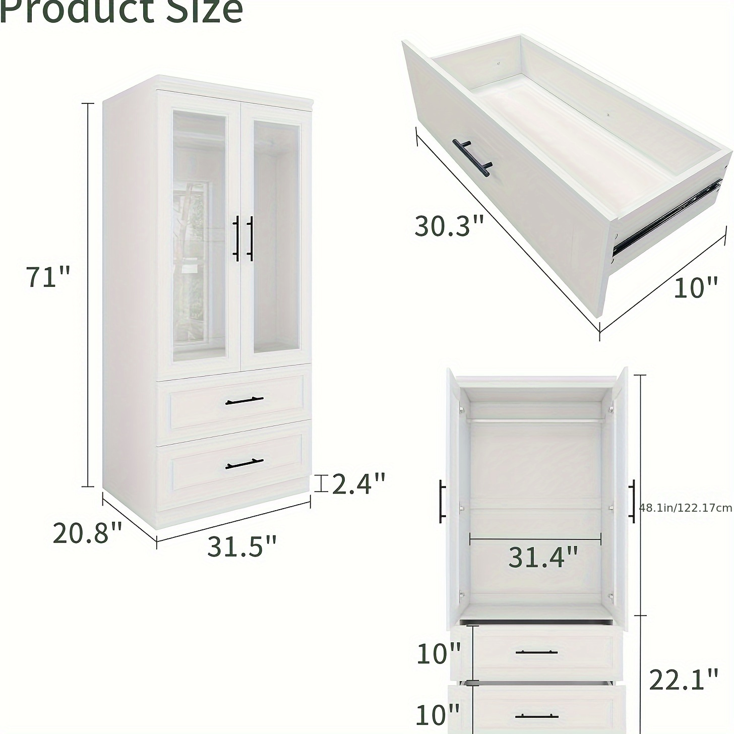 Modern White Wooden Wardrobe with 2 Drawers & Hanging Rods – Freestanding Bedroom Armoire Closet for Storage and Organization, Includes Transparent Doors and Side Pockets, Portable Closet