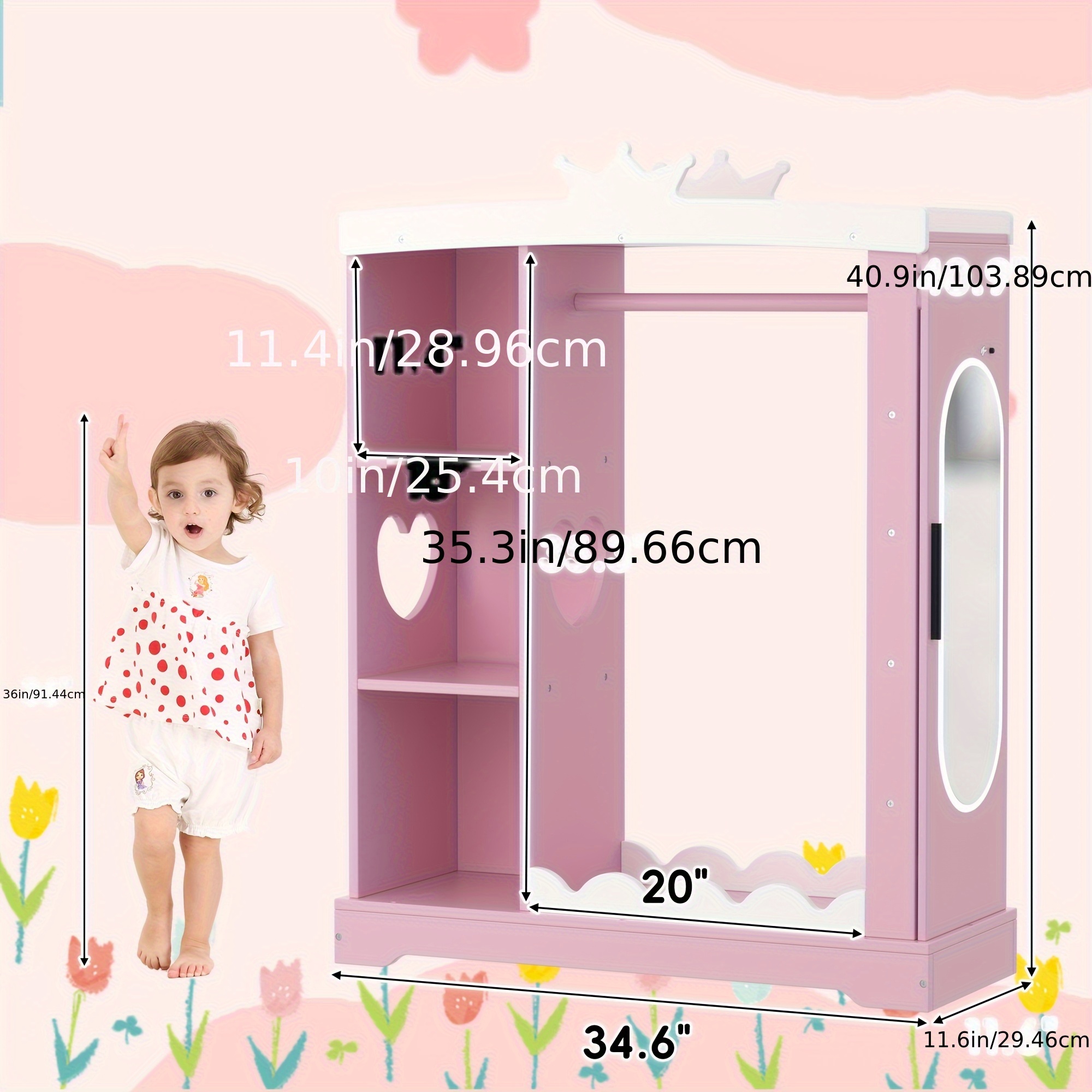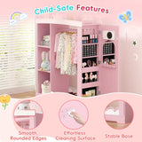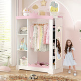 Pink Modern Kids Dress-Up Closet with Dual Mirrors, Jewelry Storage & Crown Top - Sturdy MDF Organizer with Hanging Rod, Shelves & Shoe Storage for Teen Girls Bedroom, 34.6\
